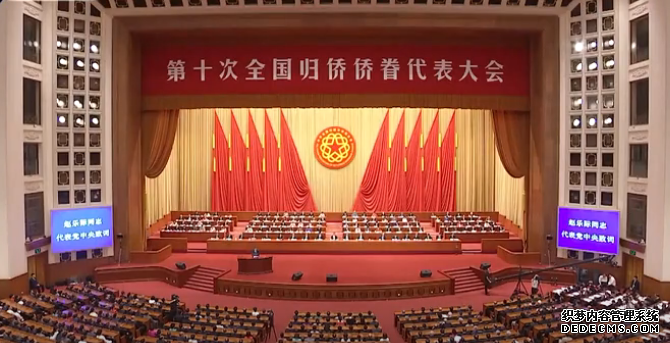 人民大会堂大礼堂灯光璀璨,气氛热烈。主席台上方悬挂着“第十次全国归侨侨眷代表大会”的会标,后幕正中象征着五大洲侨胞心向祖国的中国侨联会徽格外醒目,10面红旗分列两侧。二楼眺台悬挂着“紧密团结在以习近平同志为核心的党中央周围,坚持以习近平新时代中国特色社会主义思想为指导,团结凝聚广大归侨侨眷和海外侨胞,为实现中华民族伟大复兴的中国梦而努力奋斗!”巨型横幅。来自全国各地的近1300名归侨侨眷代表和来自110多个国家的近700名海外侨胞特邀嘉宾欢聚一堂。