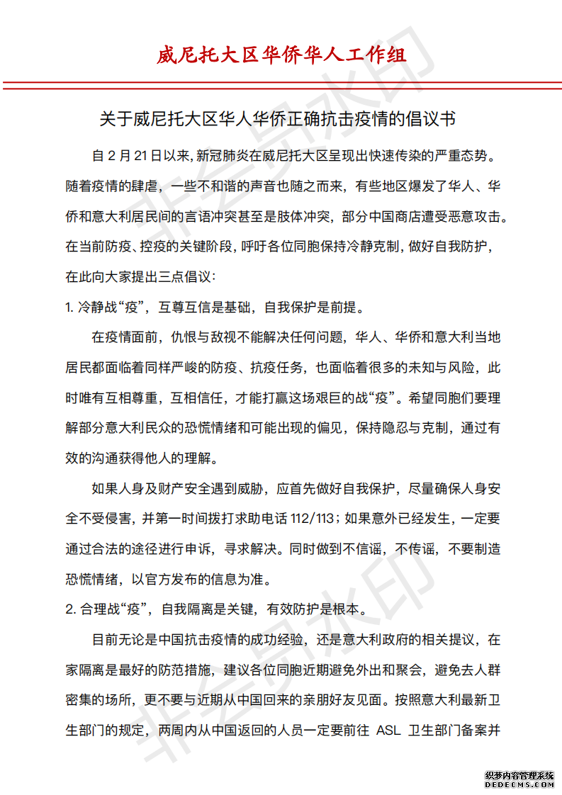 关于威尼托大区华人华侨正确抗击疫情的倡议书